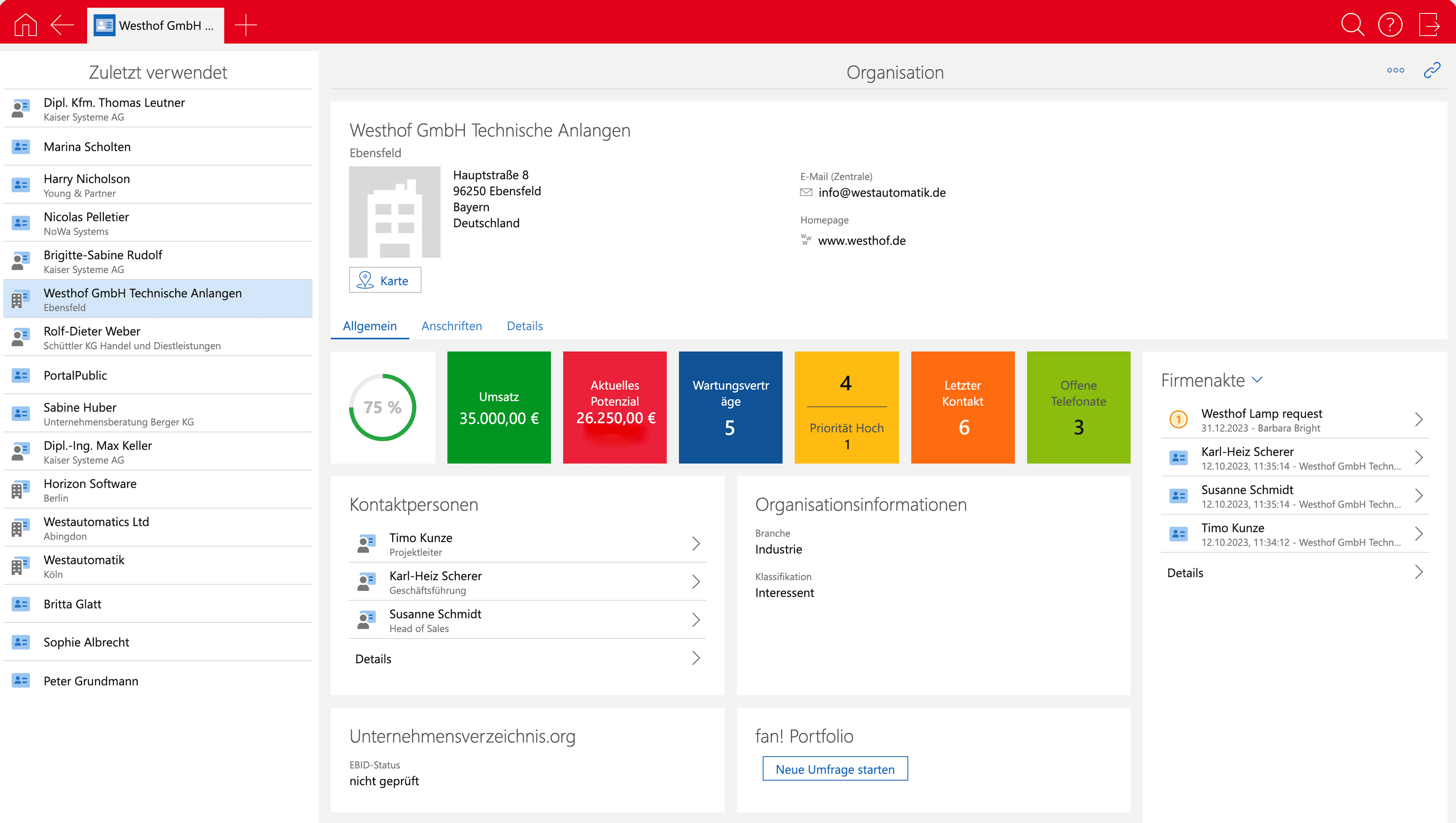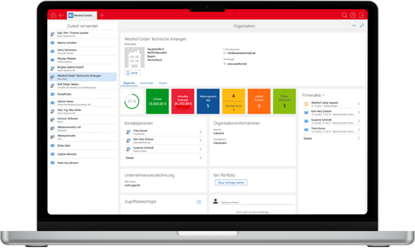 Ihre Kunden & Kontakte stehen im Mittelpunkt. Hier finden Sie alle Informationen zu Ihren Kunden und deren Ansprechpersonen. SmartWe bietet eine ausführliche Historie zu allen Kommunikationsanlässen, die übersichtlich in der Akte zusammengefasst werden.