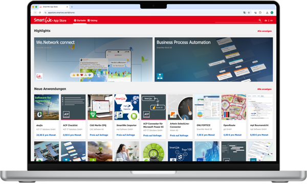 Datenquellen & Systeme können Sie über zahlreiche Schnittstellen und Adapter aus dem SmartWe-AppStore anbinden. So maximieren Sie die Effizienz Ihrer Geschäftsprozesse. SmartWe funktioniert überall und jederzeit: Ihre Daten liegen DSGVO-konform in einer deutschen Cloud – ob mit Smartphone, Tablet oder PC – im Homeoffice, im Büro und von überall.